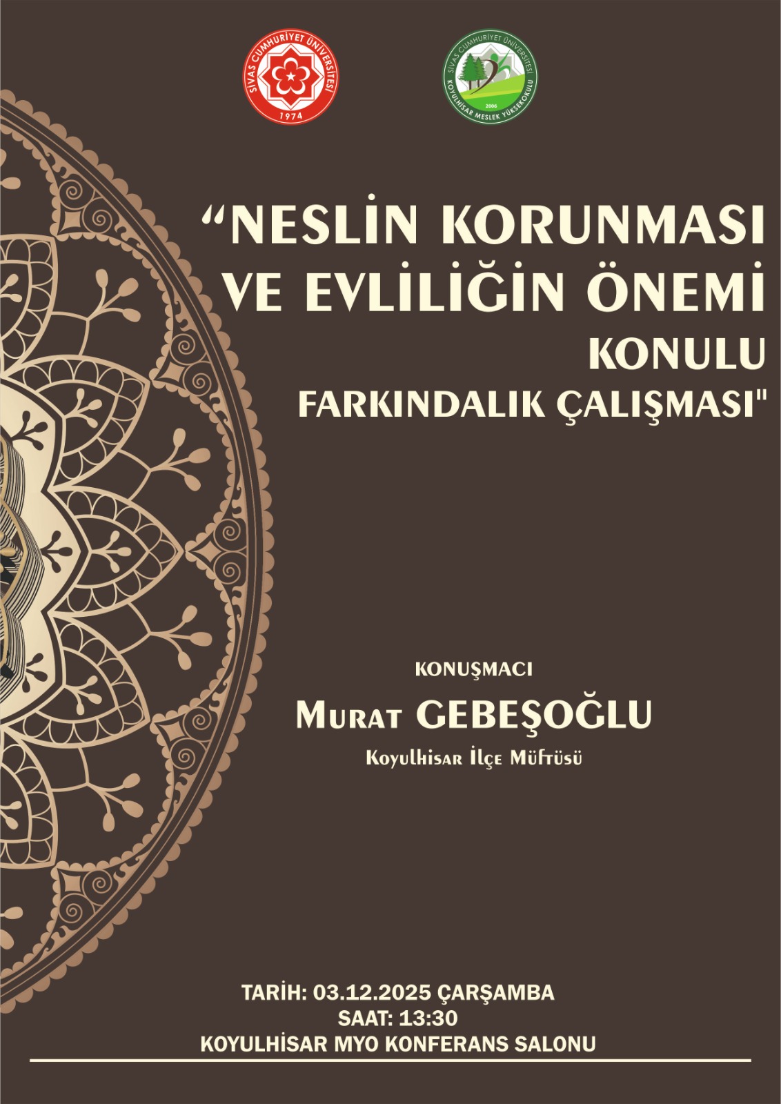 03.12.2025 tarihinde saat 13:30 da Okulumuz Konferans Salonu'nda, Koyulhisar İlçe Müftülüğü tarafından Meslek Yüksekokulumuz öğrencilerine yönelik ‘Neslin Korunması ve Evliliğin Önemi’ konulu konferans düzenlenecektir. Konferansa Koyulhisar İlçe Müftüsü Murat GEBEŞOĞLU konuşmacı olarak katılım sağlayacaktır. Konferansa katılım sağlayacak Koyulhisar İlçe Müftüsü Murat GEBEŞOĞLU'na, tüm öğrencilerimize, çalışma arkadaşlarımıza ve akademik personelimize şimdiden teşekkür ederiz.