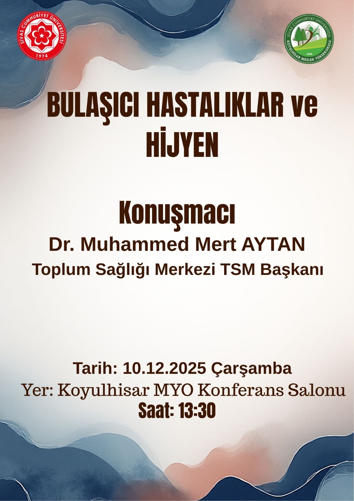 10.12.2025 tarihinde saat 13:30 da Okulumuz Konferans Salonu'nda, Koyulhisar Toplum Sağlığı Merkezi tarafından Meslek Yüksekokulumuz öğrencilerine yönelik ‘Bulaşıcı Hastalıklar ve Hijyen’ konulu konferans düzenlenecektir. Konferansa konuşmacı olarak Toplum Sağlığı Merkezi TSM Başkanı Dr. Muhammed Mert AYTAN katılım sağlayacaktır. Konferansa katılım sağlayacak konuşmacı Dr. Muhammed Mert AYTAN, tüm öğrencilerimiz, çalışma arkadaşlarımız ve akademik personelimize şimdiden teşekkür ederiz.